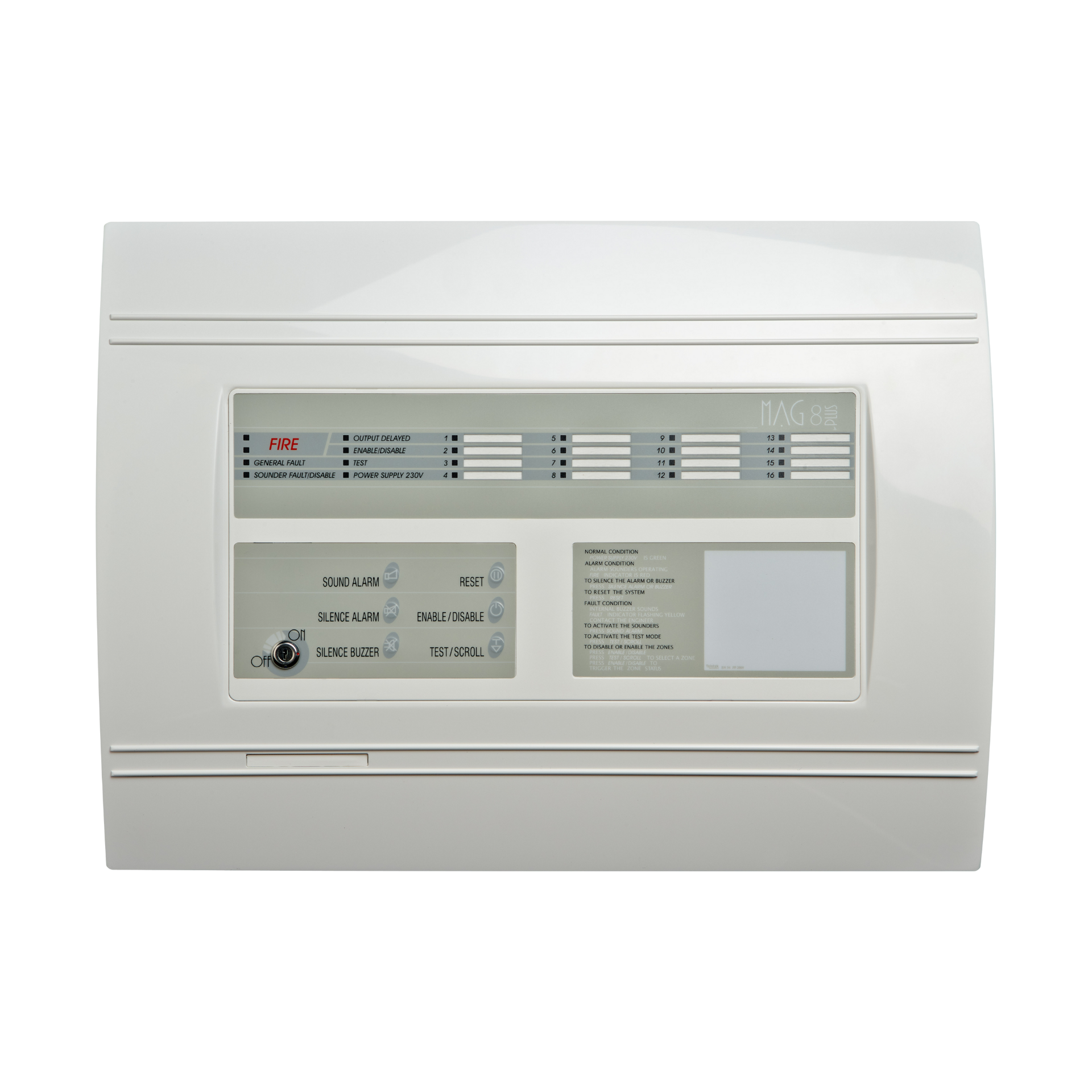 Panel, tek bir 12V/18Ah akü yedekleme gücüyle çalışacak şekilde tasarlanmıştır, bu da sistem başına bir akü değerinde maliyet tasarrufu sağlar. MAG 8 Plus, 3000 m²'den büyük büyük ofis binaları, okullar, süpermarketler ve diğer alanlar gibi çok çeşitli uygulamalar için uygundur.